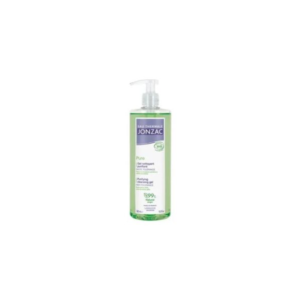 Gel nettoyant purifiant Jonzac Pure, format 500 ml. Adapté aux peaux mixtes à grasses, il élimine les impuretés tout en respectant l'équilibre de la peau, pour un teint frais et matifié.
