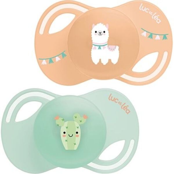 Lot de 2 sucettes Luc et Léa pour les bébés de 6 à 18 mois. Tétine orthodontique et design amusant, parfaites pour les accompagner dans leur croissance.