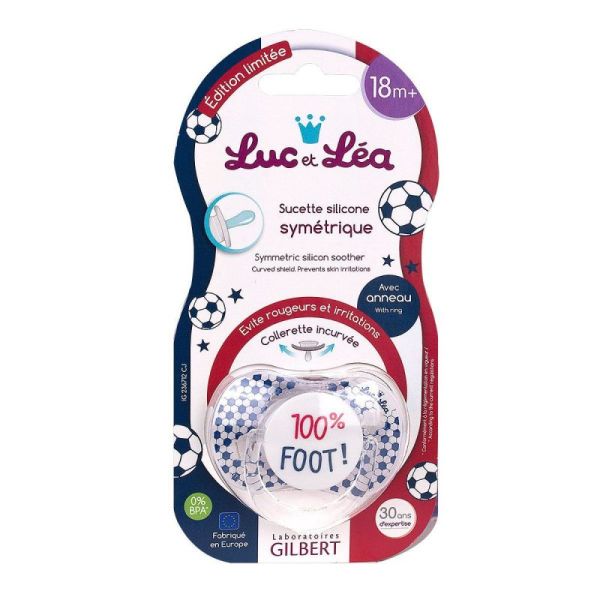La sucette édition coupe du monde 18m+ Luc & Léa est une sucette symétrique en silicone spécialement conçue pour les nourrissons de plus de 18 mois. Elle possède une collerette incurvée qui permet d'éviter les rougeurs et les irritations dues au contact prolongé de la salive sur la peau. Elle s'adapte au palais de l'enfant et respecte le développement des gencives et des dents. Cette sucette possède un anneau et son bouton est phosphorescent permettant de la retrouver facilement la nuit.